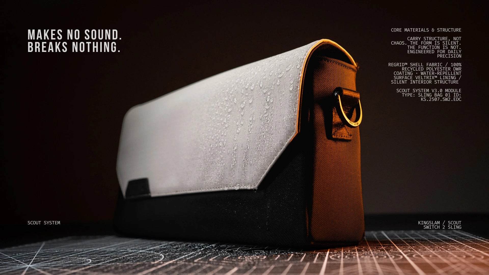Woven from 100% recycled polyester, Regrid™ is a water-resistant shell engineered for daily use. It’s not about showing off sustainability — it’s about trusting what you carry through any weather.